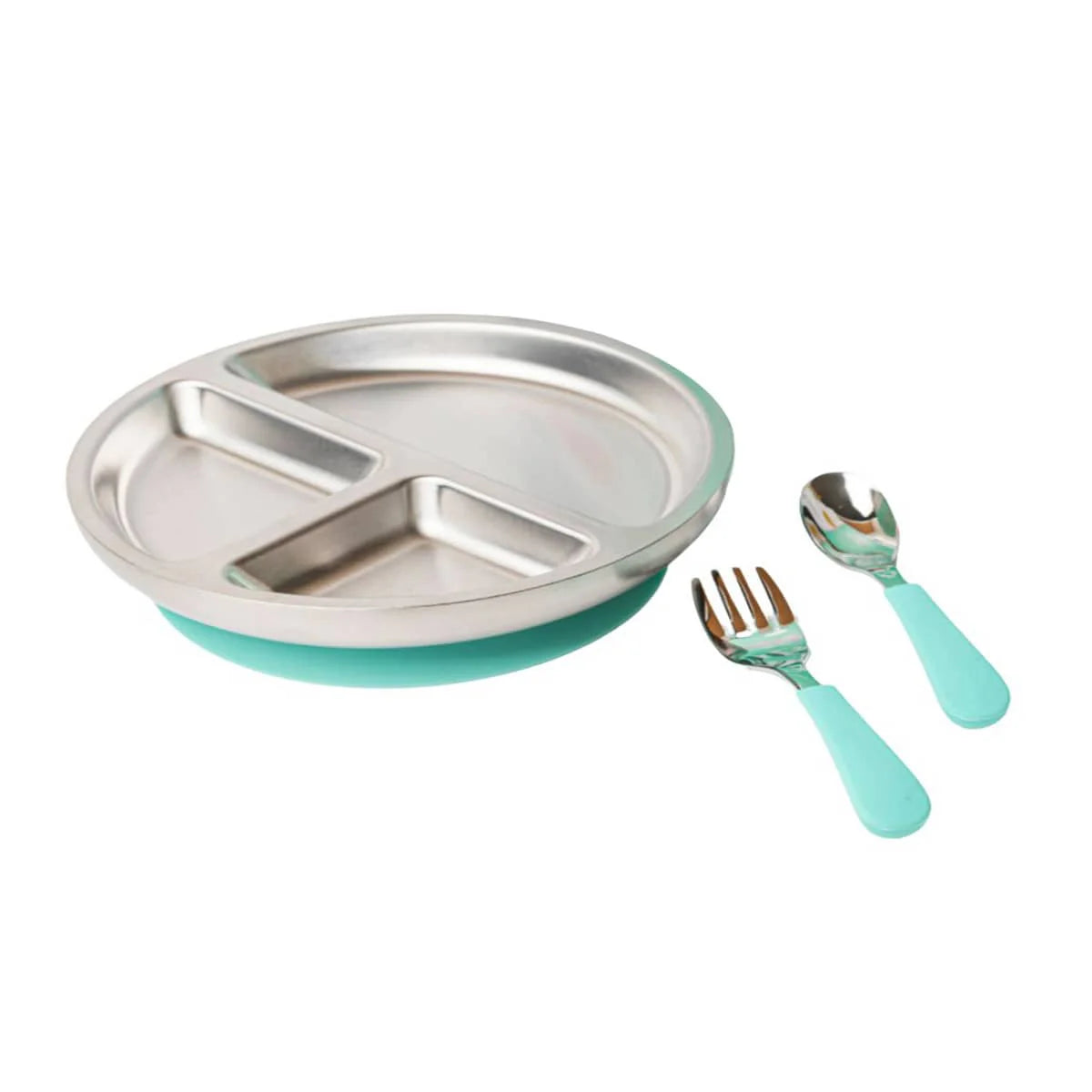 18/8 Stainless Steel Toddler Plate with Silicone Suction Base, Spoon, Fork - 3 colours