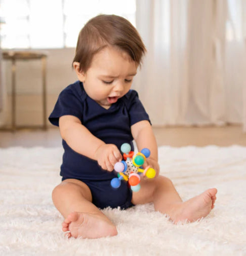 The Atom Colorpop is a vibrant and engaging toy designed to delight infants and toddlers. It features twelve bendable arms radiating from a central sphere, each adorned with colourful, textured ends and plastic rings that produce a gentle rattling sound with movement. This toy is crafted to stimulate sensory exploration and motor skill development, while also being a safe and entertaining teether for young ones. It's free from BPA and PVC, ensuring it meets rigorous safety standards.